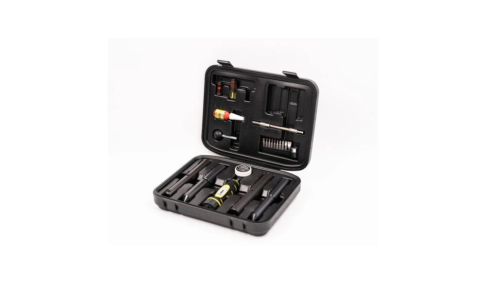 A scope mounting kit that includes alignment rods, thread locker and a lapping bar with compound for ring alignment and preparation, a leveling system for ensuring the scope is parallel to the rifle bore, and the F.A.T. (Fast Accurate Torque) Wrench with various bits for tightening screws to exact specifications. This kit comes with a durable case.